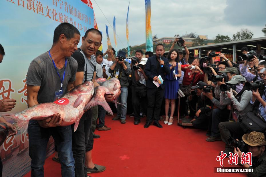 9月13日,昆明滇池迎来开湖捕鱼首日,渔民带回了多条重量在10公斤以上的大鱼并进行“鱼王竞拍”,其中一条18公斤的“鱼王”吸引眼球。图为拍卖的“鱼王”吸引摄影爱好者镜头。中新社记者 任东 摄