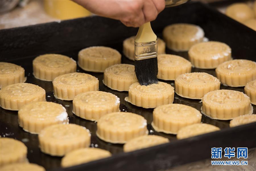 9月14日,在埃及首都开罗,“如意坊”的一位糕点师傅在给月饼坯子刷蛋液。