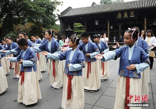 资料图:中秋佳节成都学童着汉服推广传统文化。安源 摄