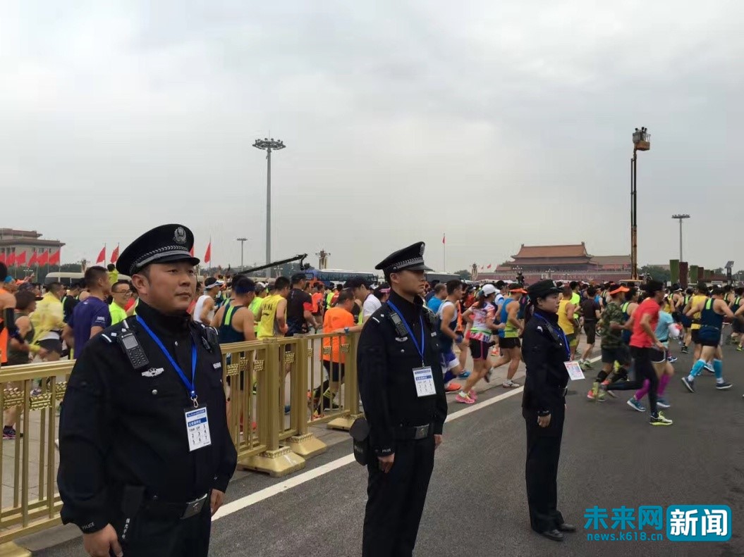 为确保2016年北京国际马拉松赛绝对安全,北京警方整合民警、武警、保安员、志愿者四种力量1.5万人,严格落实各项安保措施,确保赛事安全顺利。(北京警方供图)