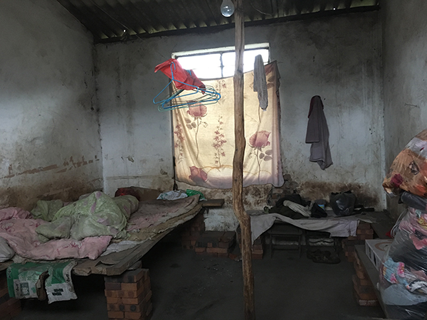 宣威市羊场镇大松树村涉事的盛恒砖厂的平房内,其中这一间窗户由木板遮挡,抽掉木板后看到如此景象,被褥像多年未洗,布满污垢。