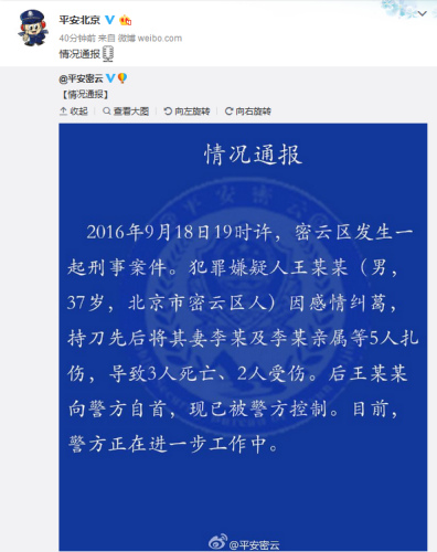 中新网9月19日电据北京市公安局密云分局官方微博“平安密云”发布情况通报,2016年9月18日19时许,密云区发生一起刑事案件。犯罪嫌疑人王某某(男,37岁,北京市密云区人)因感情纠葛,持刀先后将其妻李某及李某亲属等5人扎伤,导致3人死亡、2人受伤。后王某某向警方自首,现已被警方控制。目前,警方正在进一步工作中。