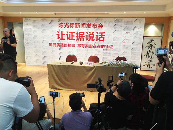 陈光标称,有关报道道听途说、恶意诽谤,给江苏黄埔再生资源利用有限公司及陈光标带来极为不利影响。此次发布会极为“特殊”,要求记者提前将采访提纲发至陈光标公司处,之后通过审核方可参加发布会。现场不仅聚集了大量媒体,还有不少经销商,澎湃新闻记者还在现场看到了不少陈光标的捐赠证明。