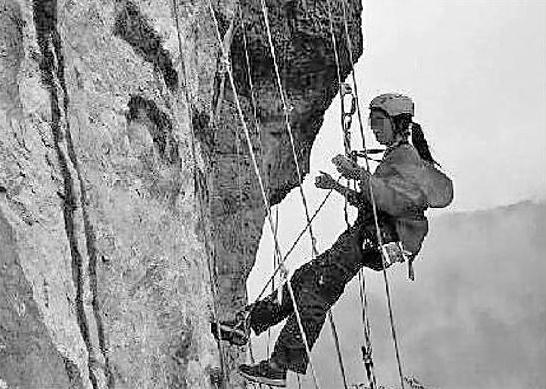 玲玲吊着绳索在岩壁上作画(网友提供)。