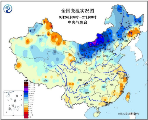 中央气象台今晨发布的消息称,预计9月27日至29日,受冷空气影响,中国中东部大部地区气温将自北向南下降4~6℃,其中,内蒙古东部偏南地区、东北地区中南部降温幅度可达8~10℃。内蒙古中东部、东北地区南部、华北东部、黄淮东部等地的部分地区有5~6级风。