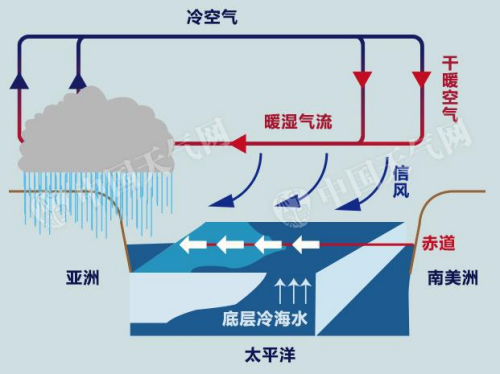 “拉尼娜”(LaNina)一词来源于西班牙语,原意为“小女孩”,指赤道中东太平洋海面温度持续异常偏冷的现象。如果海温距平3个月滑动平均值低于-0.5℃,且至少持续5个月,则判定为一次拉尼娜事件。