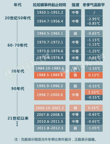 譬如,拉尼娜影响年份里,1954年冬天是其中最冷的一个冬季,气温比常年偏低2.95℃。
