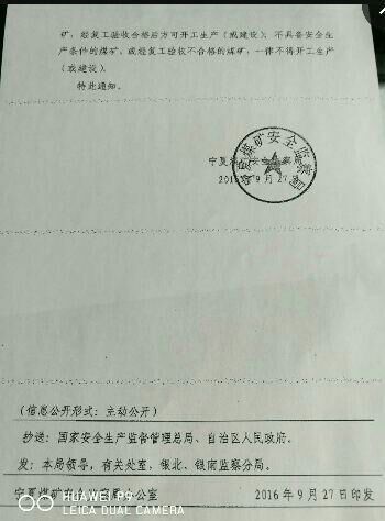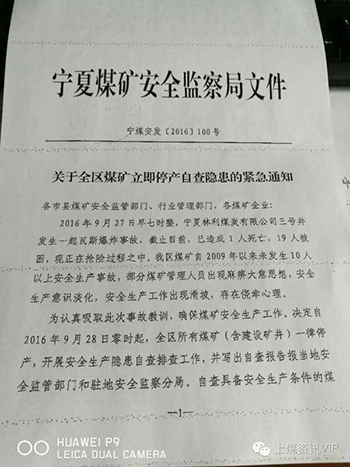 9月27日,宁夏煤矿安全监察局为认真吸取此次事故的教训,确保煤矿安全生产工作,印发紧急通知。通知指出自2016年9月28日零时起,全区所有煤矿(含建设矿井)一律停产,开展安全生产隐患自查排查工作,并写出自查报告报当地安全监管部门和驻地安全监察分局。自查具备安全生产条件的煤矿,经复工验收合格后方可开工生产(或建设),不具备安生生产条件的煤矿,或经复工验收不合格的煤矿,一律不得开工生产(或建设)。