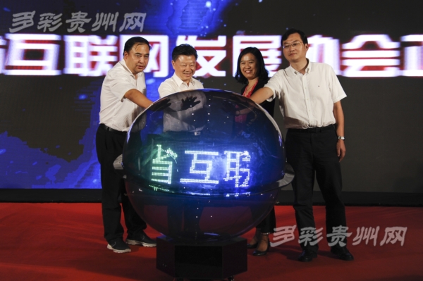 贵州省政协副主席陈海峰(左二),中央网信办网络社会工作局副局长孙爱萍(右二),贵州省委宣传部副部长、省委网信办主任谢念(右一),贵州省互联网发展协会会长、多彩贵州网有限责任公司党委书记、董事长晏世忠(左一)共同按亮预示贵州省互联网发展协会成立的水晶球
