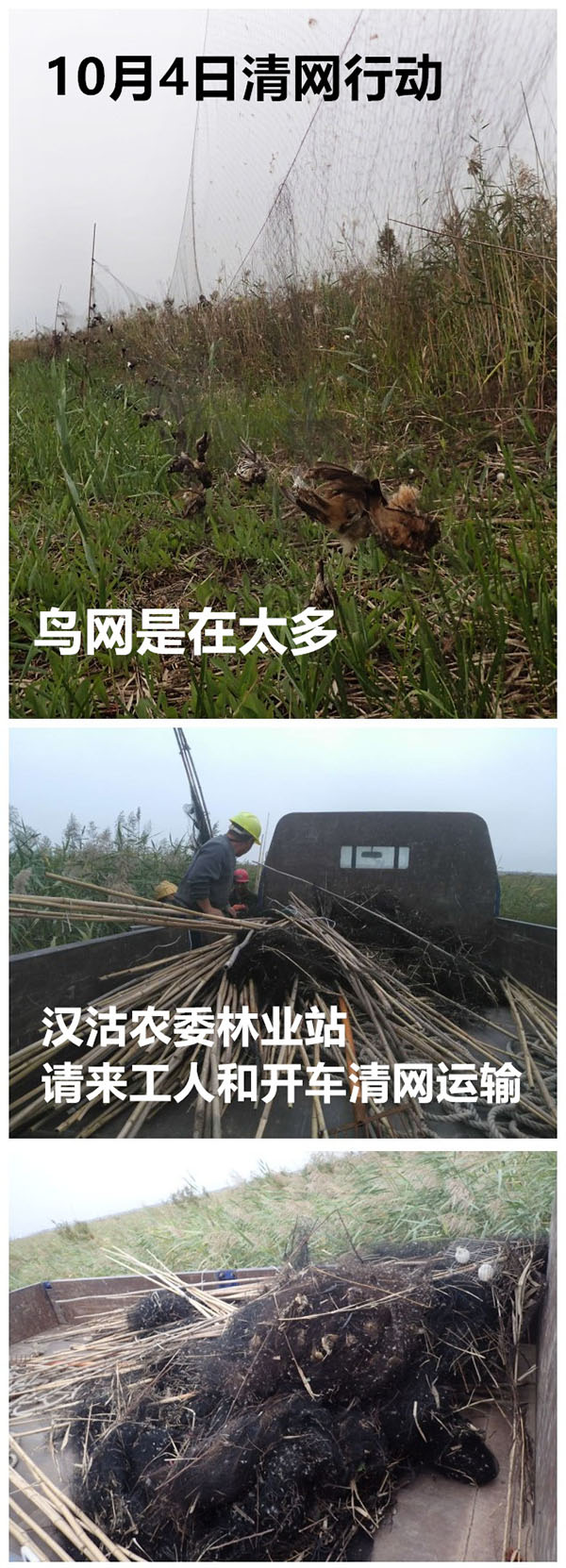 此前,9月29日下午,天津护鸟志愿者在天津滨海新区汉沽杨家泊镇高庄镇与唐山市交界区2平方公里区域发现大面积鸟网,天津护鸟志愿者联盟、天津汉沽护鸟队、“让候鸟飞”公益基金出动30人次,清理到10月1日,清除了近万米鸟网,总共解救活鸟将近1000只,在网上的死鸟2000多只。