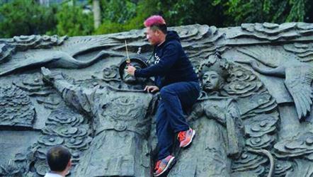 6日中午,沈阳故宫南侧两座巨型铜质浮雕群附近嬉闹声一片,两三米高的浮雕墙顶端拍照人群涌动,有全家来的,也有情侣,还有带着自拍杆的。有的游客自创情景,拿吃剩的糖葫芦“喂”清帝雕像;有的非要在帝后之间做出拆散两人的举动。有个五六岁的小女孩在妈妈怂恿下爬上最顶端,看着都让人捏一把汗。