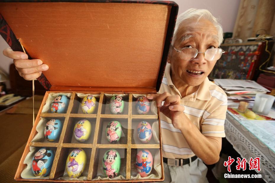这位今年78岁的老人名叫费永泉,已经在蛋壳上作画十余年。这些年来,费永泉创作的蛋壳画超过2500幅。作为京剧迷,费永泉的作品囊括了《西游记》、《三国演义》、《水浒传》、《封神演义》等古典名著中的人物形象。最近,他又创作完成了年画、生肖以及迪士尼系类蛋壳画作品。图为8月底,老人展示他的蛋壳画作品。 中新社记者 王亚东 摄