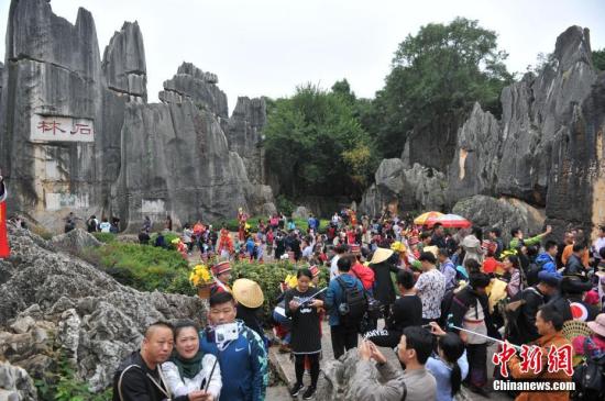资料图:10月1日,云南石林风景名胜区内游客扎堆拍照留念。中新社记者 任东 摄