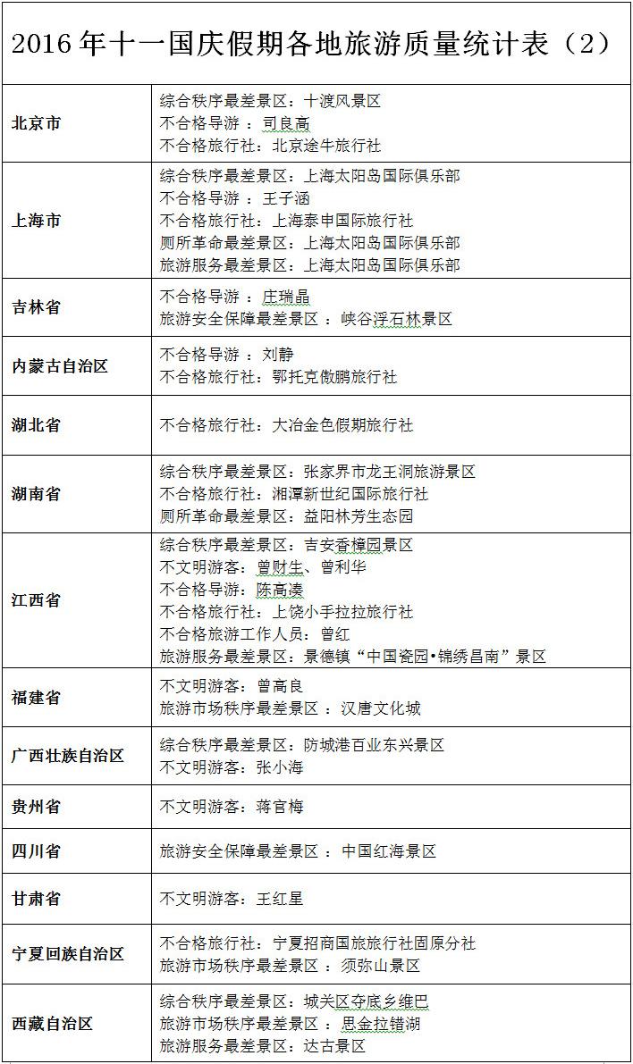中新网10月9日电 据国家旅游局网站消息,2016年国庆假日落幕,七天长假,5.93亿人次出游,无重大纠纷事件,无重特大安全事故报告。9日,国家旅游局发布十一假日旅游“红黑榜”,集中表扬一批最佳景区、优秀旅行社、优秀导游、优秀旅游工作人员和文明游客,同时也对假日期间厕所革命滞后、环境脏乱、管理混乱、服务恶劣的旅游经营单位和从业人员以及不文明游客进行了曝光。