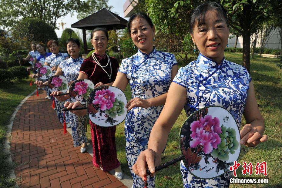 10月9日重阳节,江西省万载县龙湖公园内,万载县老年大学正举行“旗袍秀、过重阳”活动,20多名60岁以上的老年人身着旗袍,在龙湖公园优雅“走秀”,以独特的方式展现出她们的“夕阳美”。邓龙华 摄