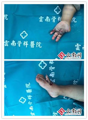 当晚6时,在确定了治疗方案后,云南骨科医院手足显微科为小明明展开了一台特殊手术。医生为他毁伤的左手进行了清创,血管、神经、肌腱探查修复术,以及骨折固定术、试行手指再植术等,还对部分损伤的手指进行了寄养。从晚上6点到凌晨1点,经过7个小时的艰难作战,医生将小明明的三根指头原位再植,成功地接上,而食指暂时“种”到脚背上,待它寄养成活且全身情况恢复良好后,再植入到手上。但遗憾的是,离断的大拇指现在还无法接上。