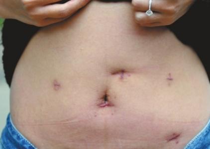 至此,郑女士一共经历了三次手术。掀开上衣,郑女士指着肚上多处缝合伤口说:“本来只有3个小孔,现在变成了6个洞,而且有3处打开、缝合了3次。”