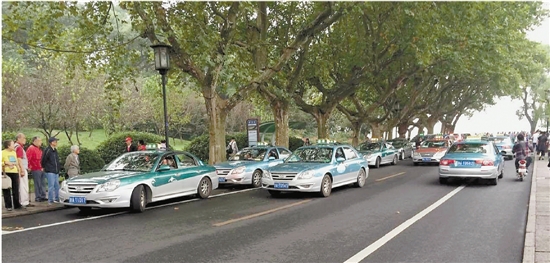 昨天中午,孤山路浙博门口停了不少候客的出租车。段罗君 摄