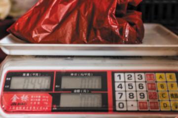 记者连着积水将装有鲜虾的袋子放在公平秤上称量,重量为0.44公斤