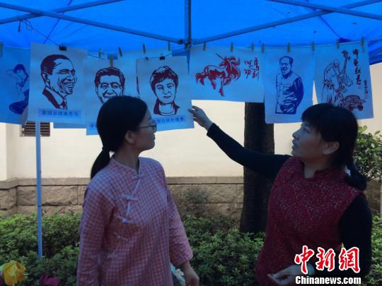 图为民间剪纸艺人为游客讲解剪纸艺术。 陈丽莎 摄