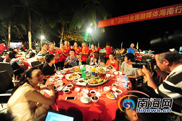 参加“全域旅游 海南范例——2016全国融媒体海南行”大型采访活动的52家全国融媒体记者在三亚东海龙宫餐厅欣赏椰风海韵,品尝地道海南美食。南海网记者 沙晓峰 摄