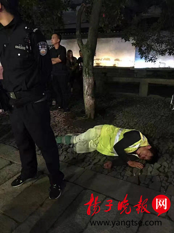 25日晚上7点左右,扬子晚报记者联系上了一位当时在现场的热心市民——朱先生。据了解,朱先生是一支名叫蓝骑士的美式橄榄球俱乐部的成员,当晚,他刚好路过。发现有人倒地后,朱先生立马上前查看,朱先生说:“我第一反应就是看看他还有没有生命体征,发现他呼吸还算正常,松了口气。当时,环卫工左眼眉角破了,左边脸已经浮肿,嘴唇外翻,有鲜血流出。”检查完毕后,朱先生担心救护车找不到地方,便跑去路口找,半路正好碰到了医生,便将医生带到了现场。随后,朱先生还跟医生、辅警一起,将环卫工抬上了救护车。