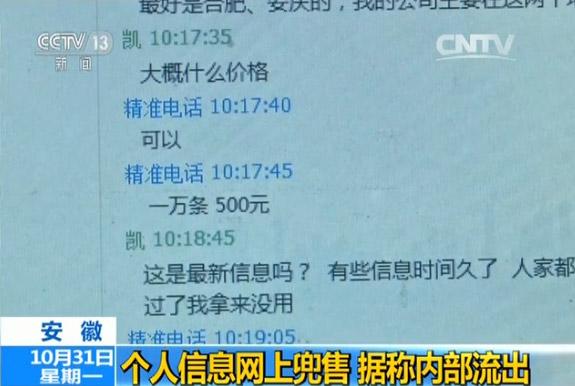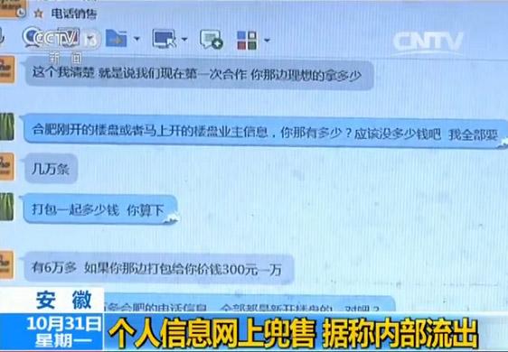 央视记者通过QQ联系上一名倒卖个人信息的人员,表示想买一些安徽合肥的小区业主信息,对方立即开价,1万条信息500块钱,如果要的数量多,只要300块钱就能买到1万条。记者汇款之后,对方很快发过来一张表格,上面有2000多位业主的信息,包括业主姓名、电话、房号等,一应俱全。记者尝试着拨打之后,发现大多数内容都是真实的。