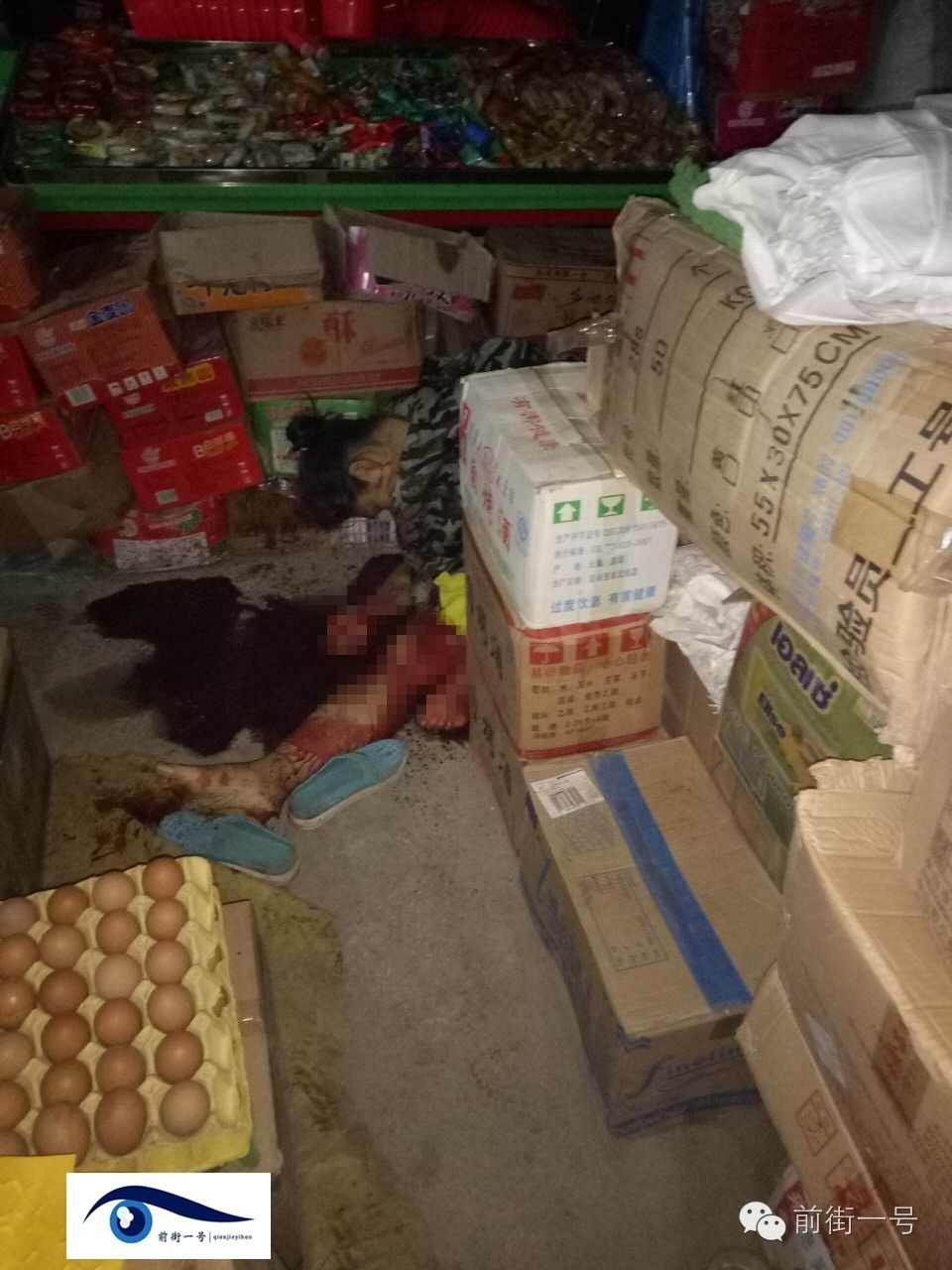 王先生说,次日凌晨3点,警方在距离店铺6、7米远的一个小水坑里发现一把沾有血迹的匕首,“刀刃长约15厘米。”王先生提供的照片显示,在一间堆满食品箱和杂货的屋内,两名女子倒在血泊之中,带白手套的工作人员对死者进行查看。