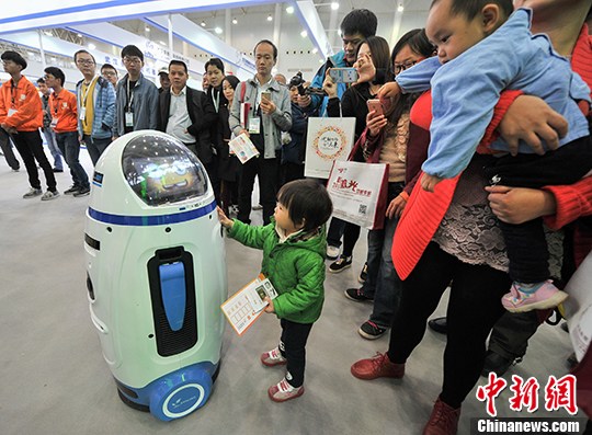 展会上的一款家庭用智能机器人吸引小朋友目光。 中新社记者 张畅 摄
