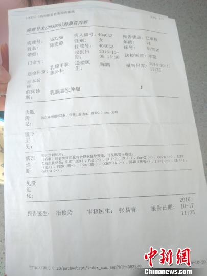 雯静的诊断结果上赫然写着:乳腺恶性肿瘤。 佘丽莎 摄