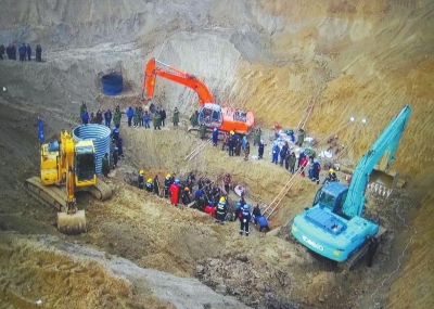 挖掘机紧张作业,搜救人员在井口持续救援。