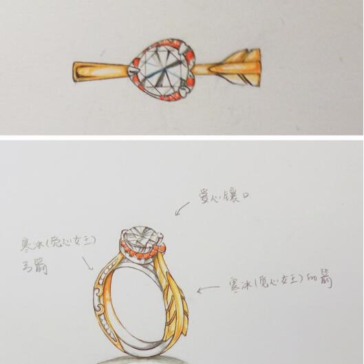 这次她只是在微博上艾特了小伙,说用两人的爱情故事定制婚戒,更用心更有纪念意义,因为婚戒只属于两个人,不想和第三个人撞款。没想到小伙子立刻带上全部积蓄,拉着自己到店里,用两人的爱情故事以及她最喜欢的游戏人物觅心女王为设计元素,定制名为“一箭穿心”求婚钻戒。