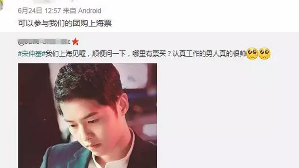 今年6月,王小姐在发现官方平台门票售罄后,在微博发布寻求宋仲基上海粉丝见面会的消息,希望可以找到新的票源一睹偶像真容。6月24日下午,一则转发让王小姐兴奋不已,“亲,可以参与我的的团购上海票。”寻获门票的喜悦让王小姐放松了警惕,她立即联系对方添加微信,在微信那头,一名男子再三保证所售门票系独家渠道获取后,王小姐为自己和朋友订了11张门票,并通过微信支付了共计19000余元的票款,双方约定付款后门票通过快递交付。