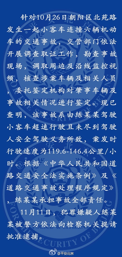 针对10月26日朝阳区北苑路发生一起小客车连撞六辆机动车的交通事故,交管部门依法开展调查取证工作,勘查事故现场,调取周边及沿线监控视频,核查涉案车辆及相关人员,委托鉴定机构对肇事车辆及事故相关情况进行鉴定。现已查明,该事故系由练某某驾驶小客车超速行驶且未尽到驾驶人安全驾驶义务所致,案发时行驶速度为119.6-146.4公里/小时。根据《中华人民共和国道路交通安全法实施条例》及《道路交通事故处理程序规定》,练某某承担事故全部责任。