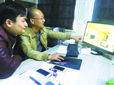钟明金(右)和刘向南(左)在讨论装修方案。