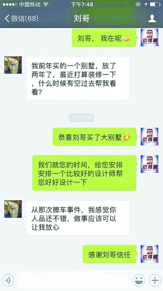 这两年多,两人的联系只停留在简单的朋友圈“点赞”和节日问候,直到最近刘向南准备装修自己的别墅。“装修就怕被坑,找个人品好的装修老板比什么都重要。”刘向南说,他的装修预算在80万元左右,没有考虑其他任何一家装修公司,直接找了钟明金。他跟妻子说了擦车事件后,妻子二话没说,支持他的决定。