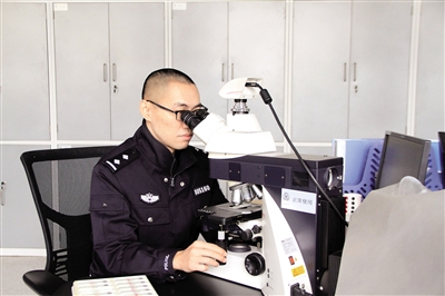 王昊在显微镜下阅片,对脏器的损伤和病变进行诊断。本报记者 平索茜 摄
