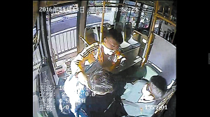 从车内监控来看,冲上车的男子一人身穿蓝色衣服,一人穿黄色衣服。蓝衣男子在前跑,黄衣男子在后面追。8点52分,蓝衣男子直接冲到司机旁边,死死抱住方向盘,嘴里叫着:“有人打我,有人打我。”而黄衣男子紧随而至,不停扭打蓝衣男子,并且说蓝衣男子是“小偷”。