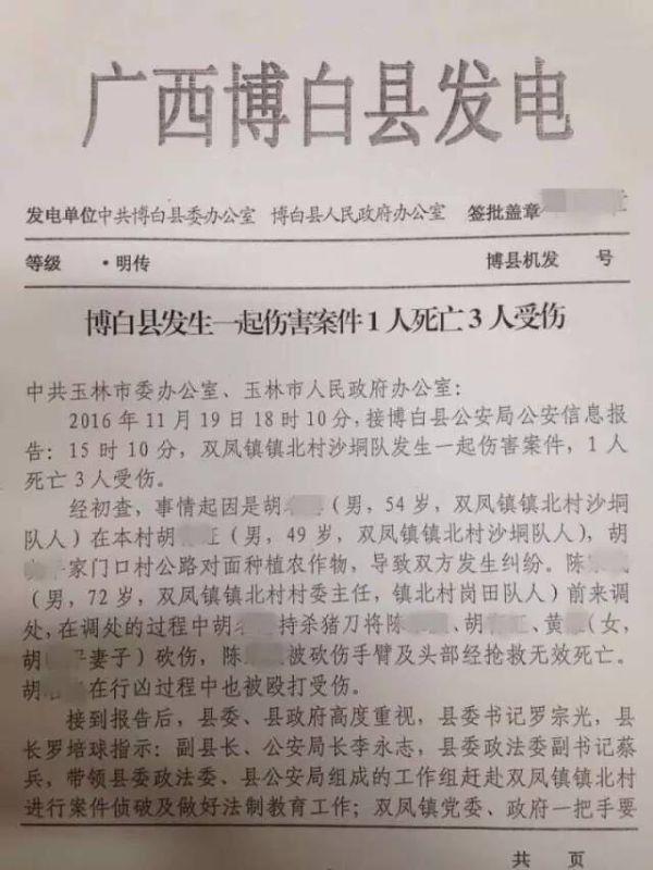 11月19日下午,广西省玉林市博白县发生一起持刀伤人事件。知情人士提供的博白县政府的通报材料显示,双凤镇镇北村沙垌队的伤害案件发生在19日15时10分,致1人死亡3人受伤。
