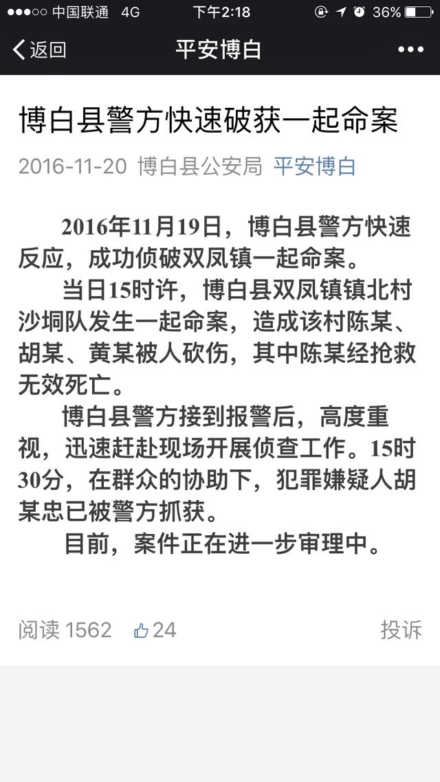 20日凌晨,博白县公安局发布通报称,当天15时30分,在群众的协助下,犯罪嫌疑人胡某忠已被警方抓获。