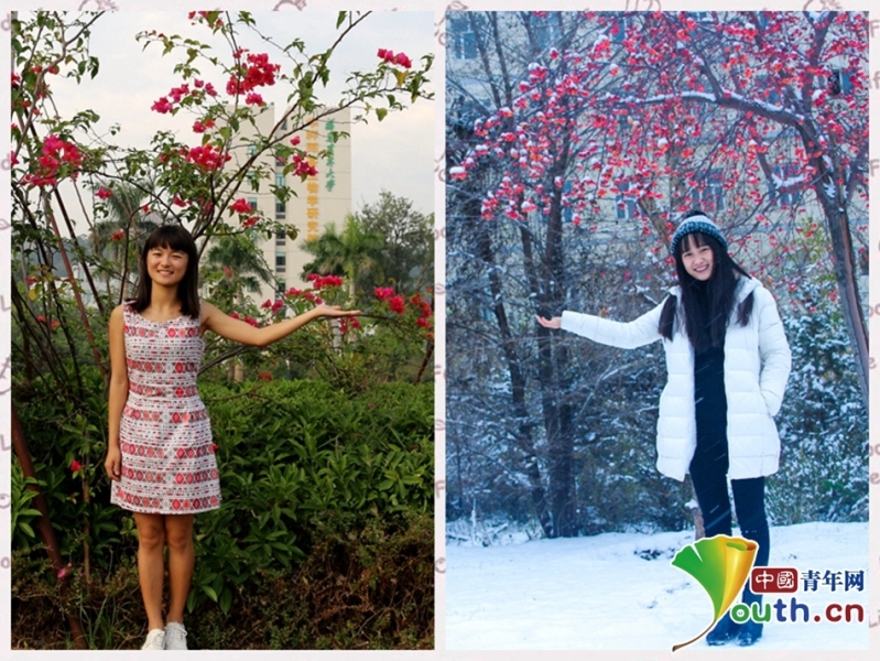 “我的南方的校园里四季如春,绿意盎然。”“我在北方的校园中大雪纷飞,满树银花。”中国青年网通讯员 赖丽萍 杨坤 摄 中国青年网北京11月21日电(记者 崔宁宁 通讯员 赖丽萍刘倩)“南国春意浓,北国正冰封”。