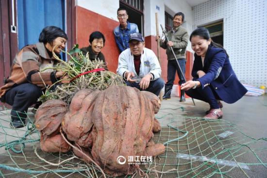 “一株番薯111斤,了不起!”11月22日,浙江省诸暨市浬浦镇盘山村村民将李恺种植的单株大番薯(共17个)过称,重量为111斤。