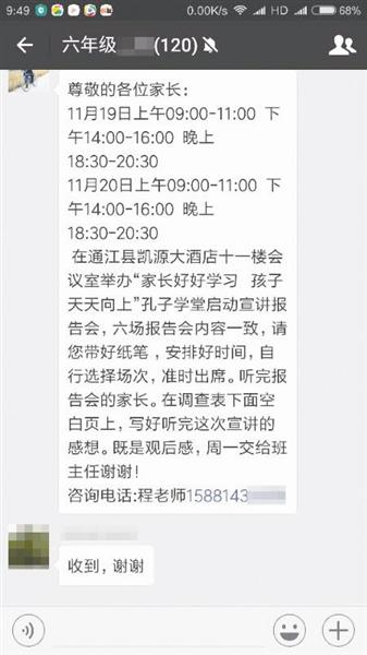 11月17日,四川省通江县实验小学的家长收到老师发在班级群的通知,请家长安排时间到当地某酒店听报告会,随后,孩子带回调查表,调查表称“参会后务必认真填写调查,并交给班主任”。