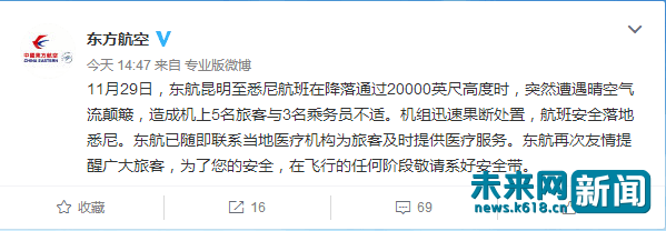 东方航空官方微博于14:47便回应此事称,11月29日,东航昆明至悉尼航班在降落通过20000英尺高度时,突然遭遇晴空气流颠簸,造成机上5名旅客与3名乘务员不适。机组迅速果断处置,航班安全落地悉尼。东航已随即联系当地医疗机构为旅客及时提供医疗服务。东航再次友情提醒广大旅客,为了您的安全,在飞行的任何阶段敬请系好安全带。