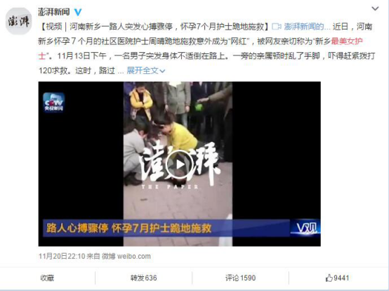 近日,河南新乡怀孕7个月的社区医院护士周晴跪地施救意外成为“网红”,被网友亲切称为“新乡最美女护士”。11月13日下午,一名男子突发身体不适倒在路上。这时,路过的周晴毫不顾忌自己怀有身孕的情况,立即对昏迷男子实施急救。由于做心肺复苏术只有双臂垂直用力,才能使上劲,周晴不得不挺着肚子跪地施救。30秒后,男子苏醒过来。120救护车赶到后,急救医生确认男子已脱离生命危险。医生表示,病人刚才是心搏骤停,如果不是周晴及时对病人施行了心脏复苏术,病人就有可能失去宝贵的生命。