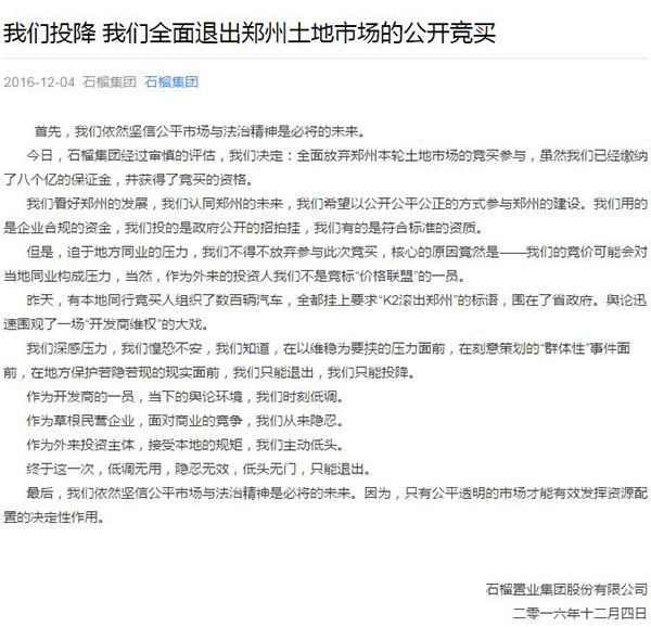 12月4日凌晨3时29分,石榴集团微信公众号发出这样一则消息,“我们投降,我们全面退出郑州土地市场的公开竞买”。