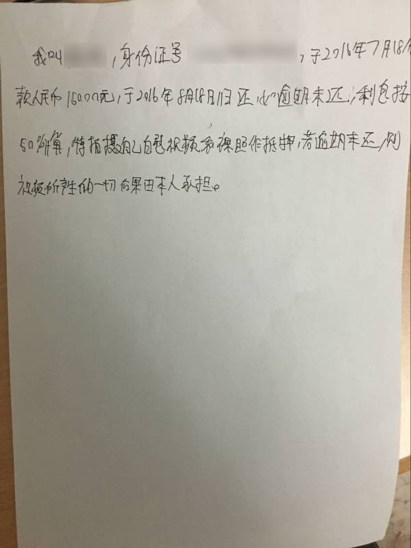 从借条本身来看,26人借款金额被泄露,最高的是2.3万元,最低的是1000元,多数人的借款金额在2000元到6000元之间,这部分人占比38.5%。而从借款期限来看,被泄露的24条记录中,最长的是9个月,最短的为5周。其中,5人借款期限为2周,5人为1个月,4人为1周。可以说大多数人都是短期应急借款。从利息来看,最高的为每周收取本金15%的利息,还有人2个月被收取本金100%的利息,远远高出年化24%以内的法律保护的民间借贷利率规定。