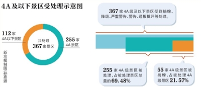 国家旅游局昨日通报,通过前段时间的集中暗访、检查,截至目前,共有367家4A级及以下景区受到摘牌、降级、严重警告、警告、通报批评等不同程度处理,107家景区被摘牌,其中包括55家4A级景区。