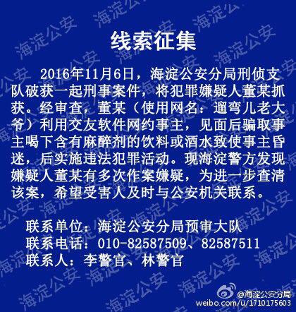 目前海淀警方发现嫌疑人董某有多次作案嫌疑,为进一步查清该案,希望受害人及时与公安机关联系。
