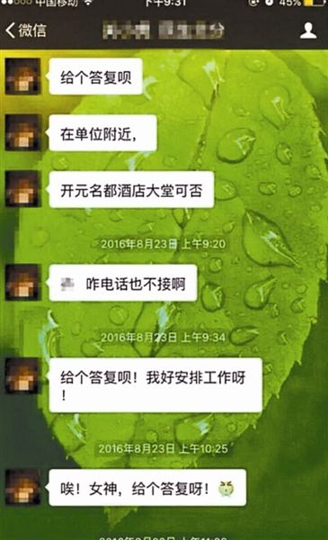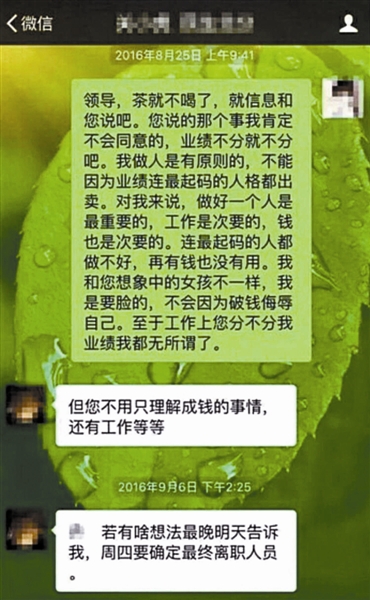 “周一早上在某某酒店喝茶可否?”“见面聊聊不会这么难吧?”“周四要确定最终离职人员……跟你说过,还有其他选择,看你自己咋做了。”类似的骚扰消息,王琪(化名)已经从业务副总经理那里接收到很多次了。